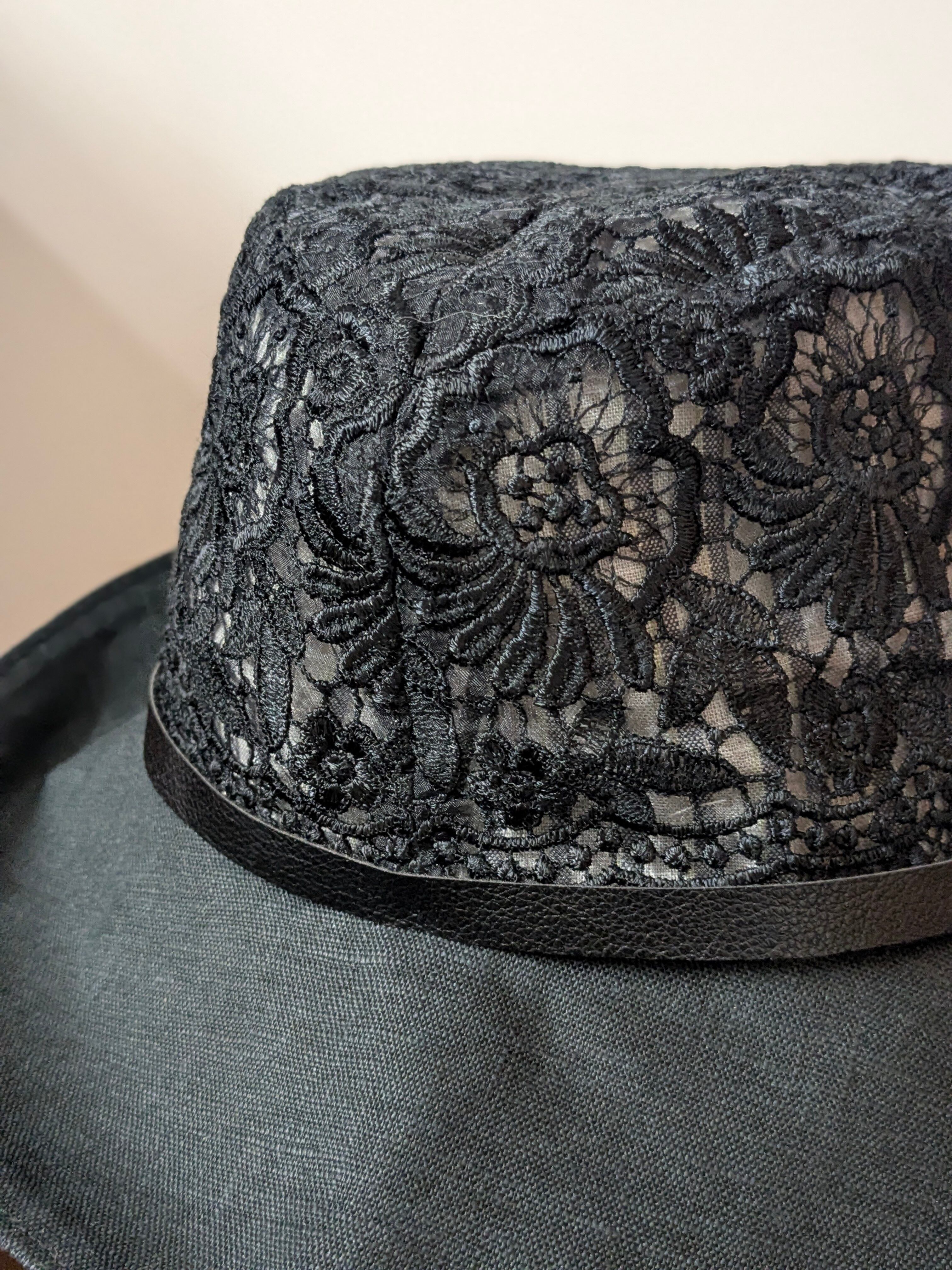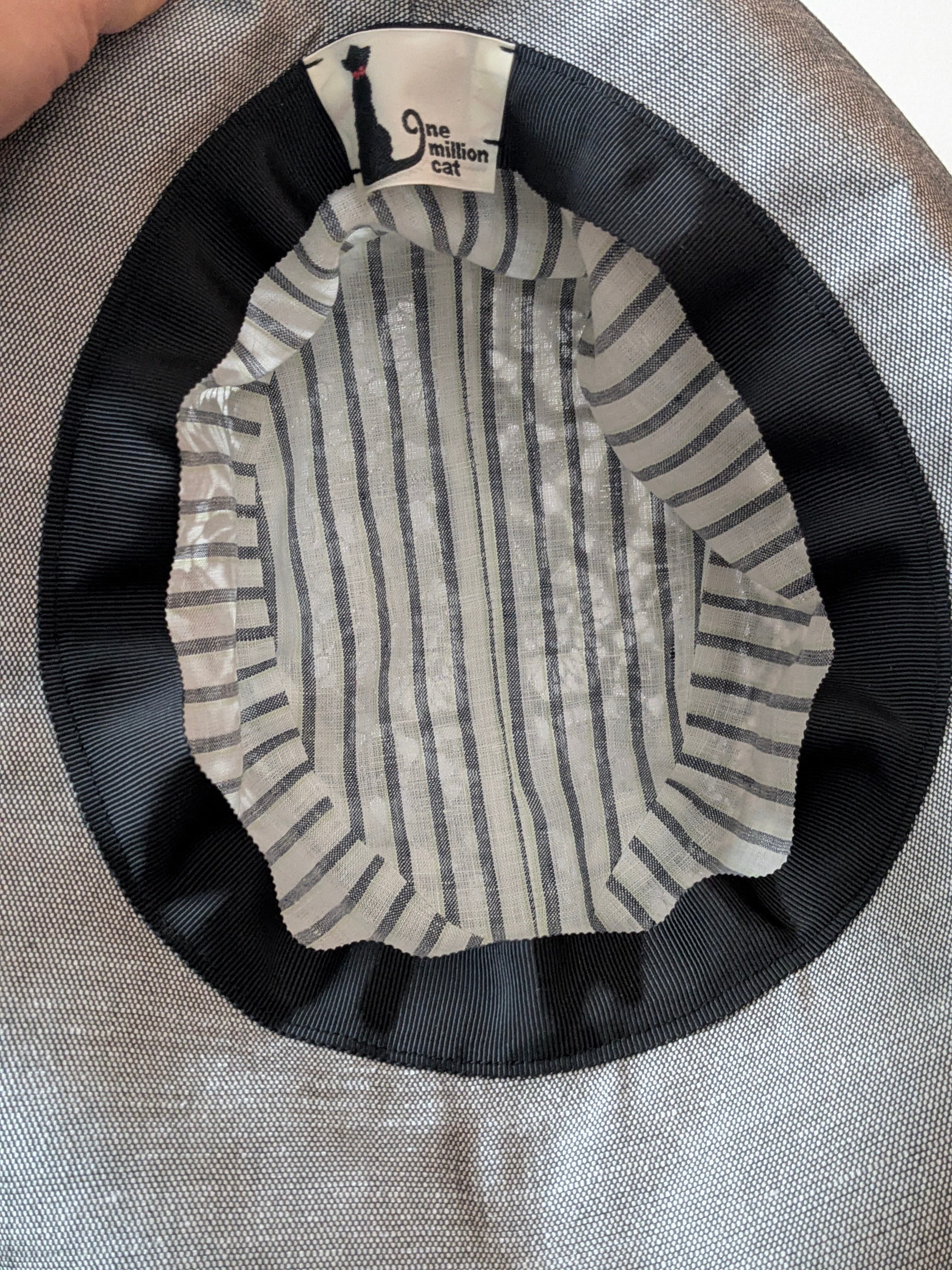 上品な印象の黒の花刺繍が施された、57cmのつば広ハットです。このアイテムは、透け感のある生地の奥にストライプ柄がちらっと見えるデザインが、おしゃれ心をくすぐるポイントです。