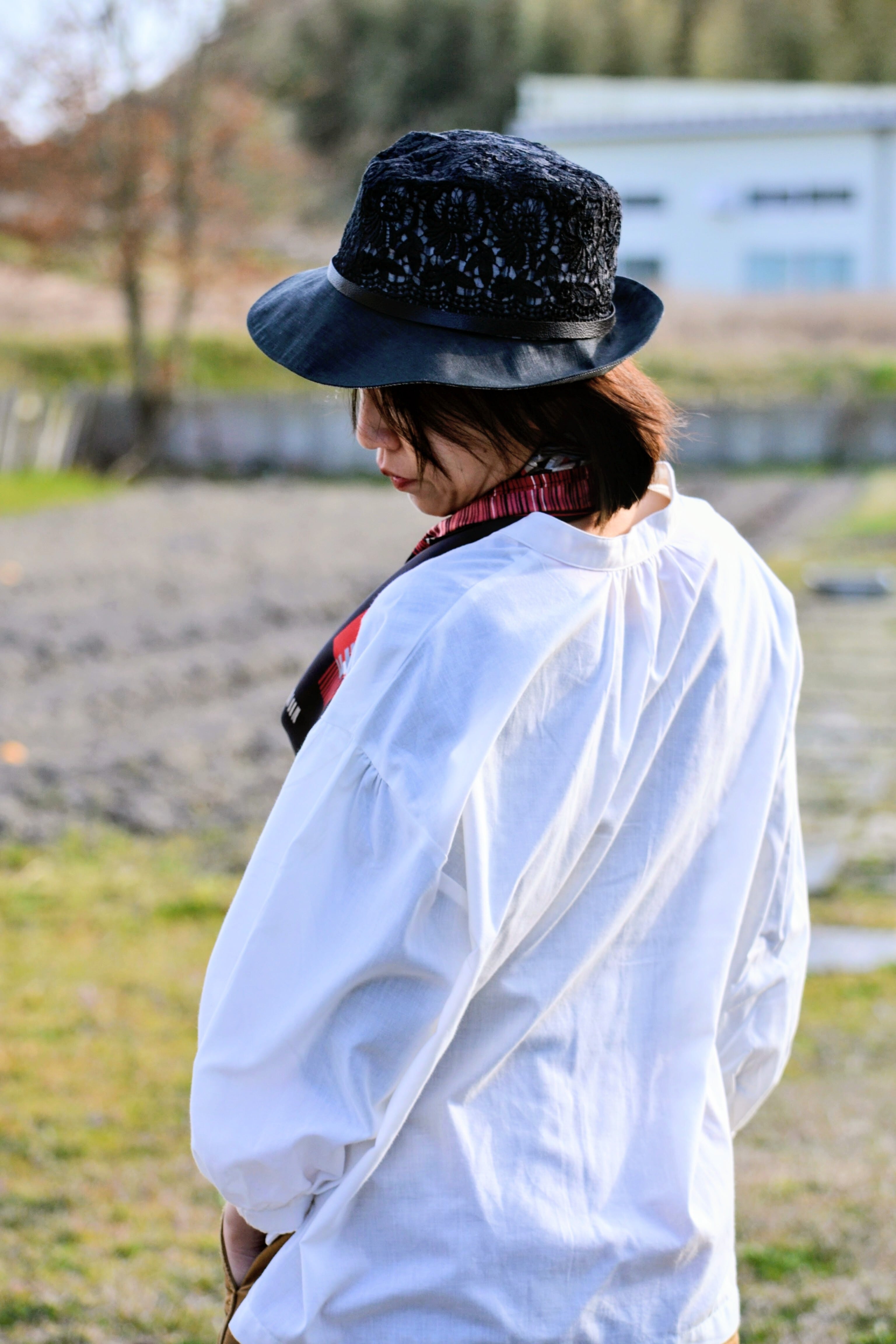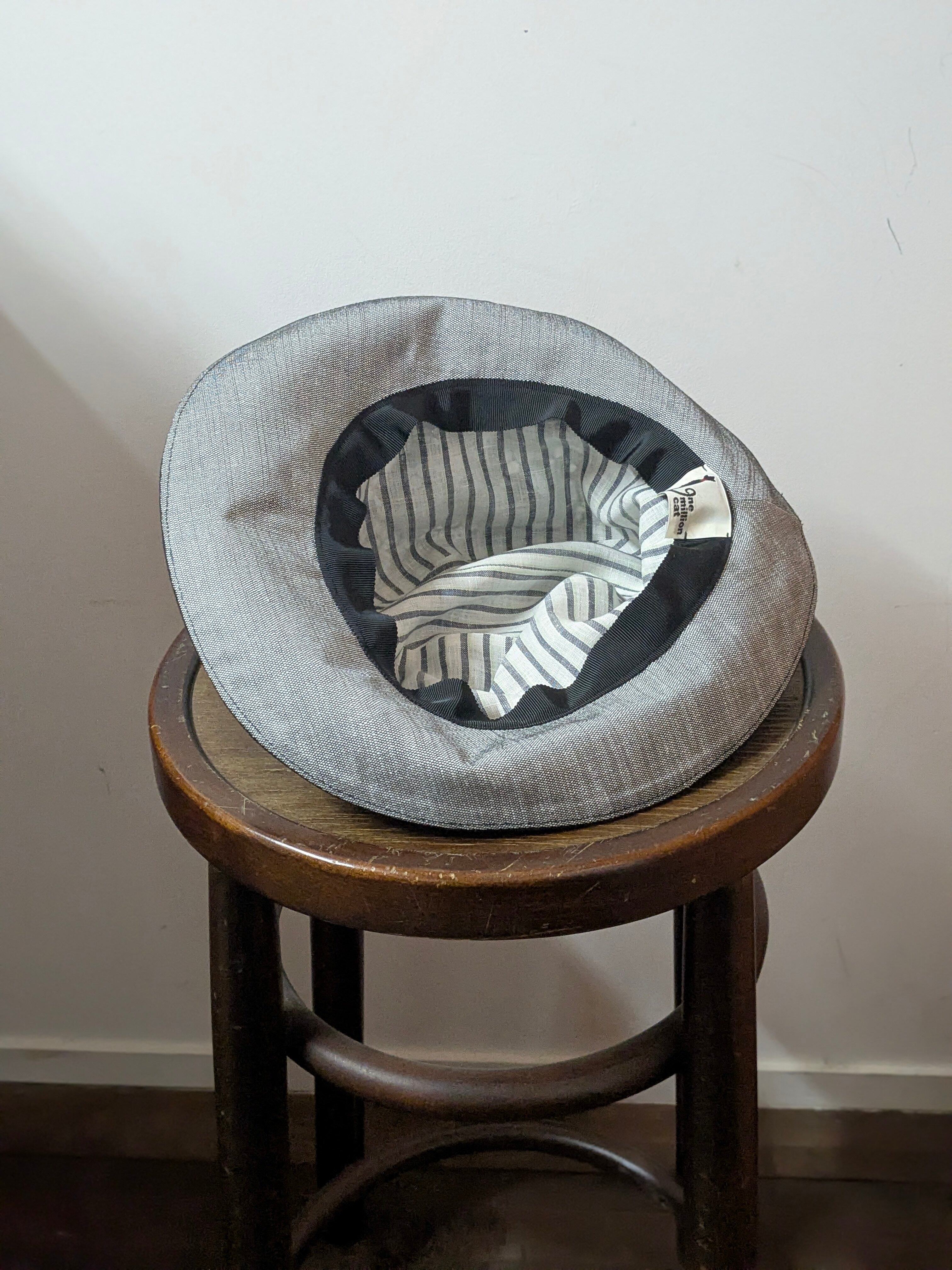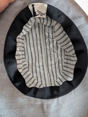 つばは広めで、しっかりとした素材感が心地よく、つば裏には光沢のあるグレーが施されています。これにより、顔周りを明るく見せるだけでなく、他のコーディネートにも品格をプラスします。