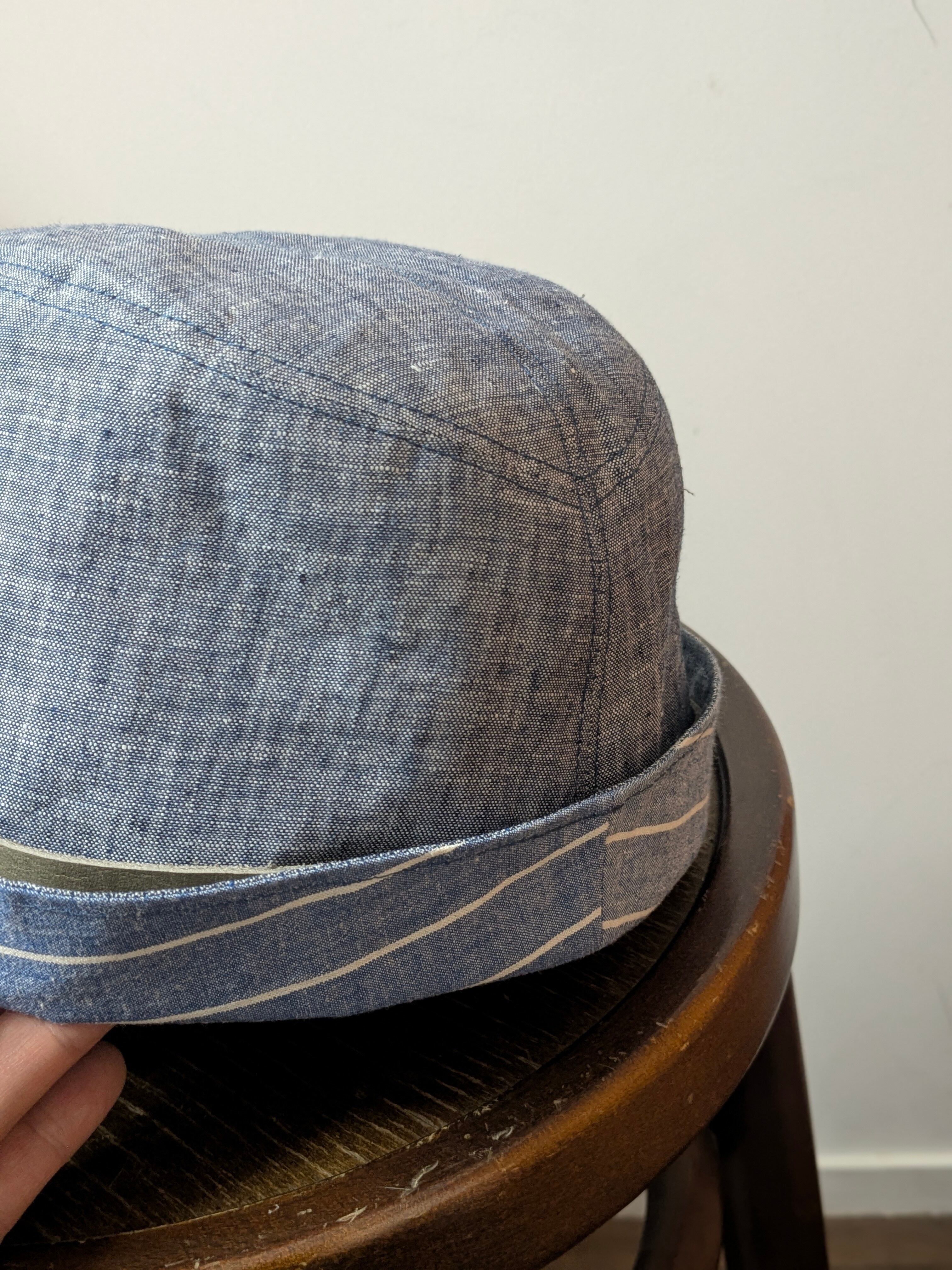 ツバの後部分がクルンとなっているのがポイントで、後ろから見たらストライプ賀見えてポイントになります。