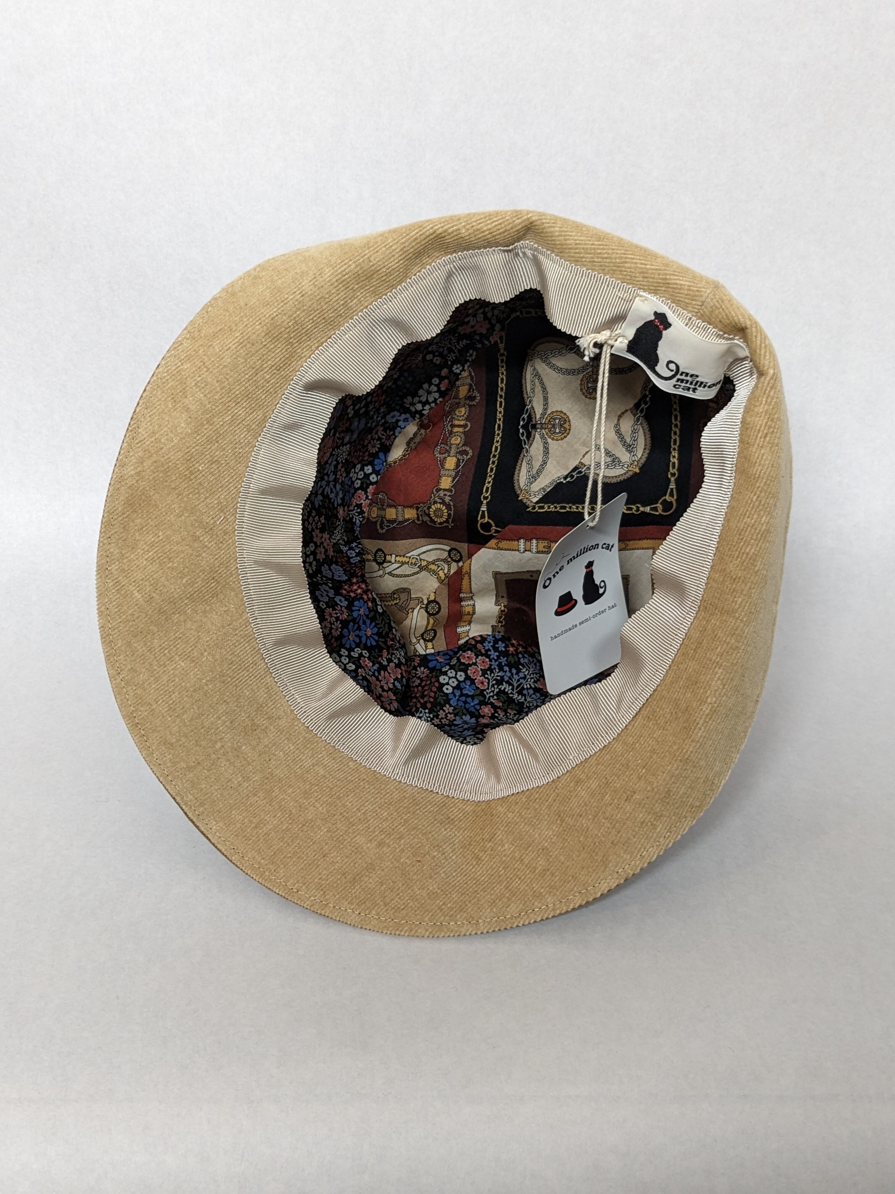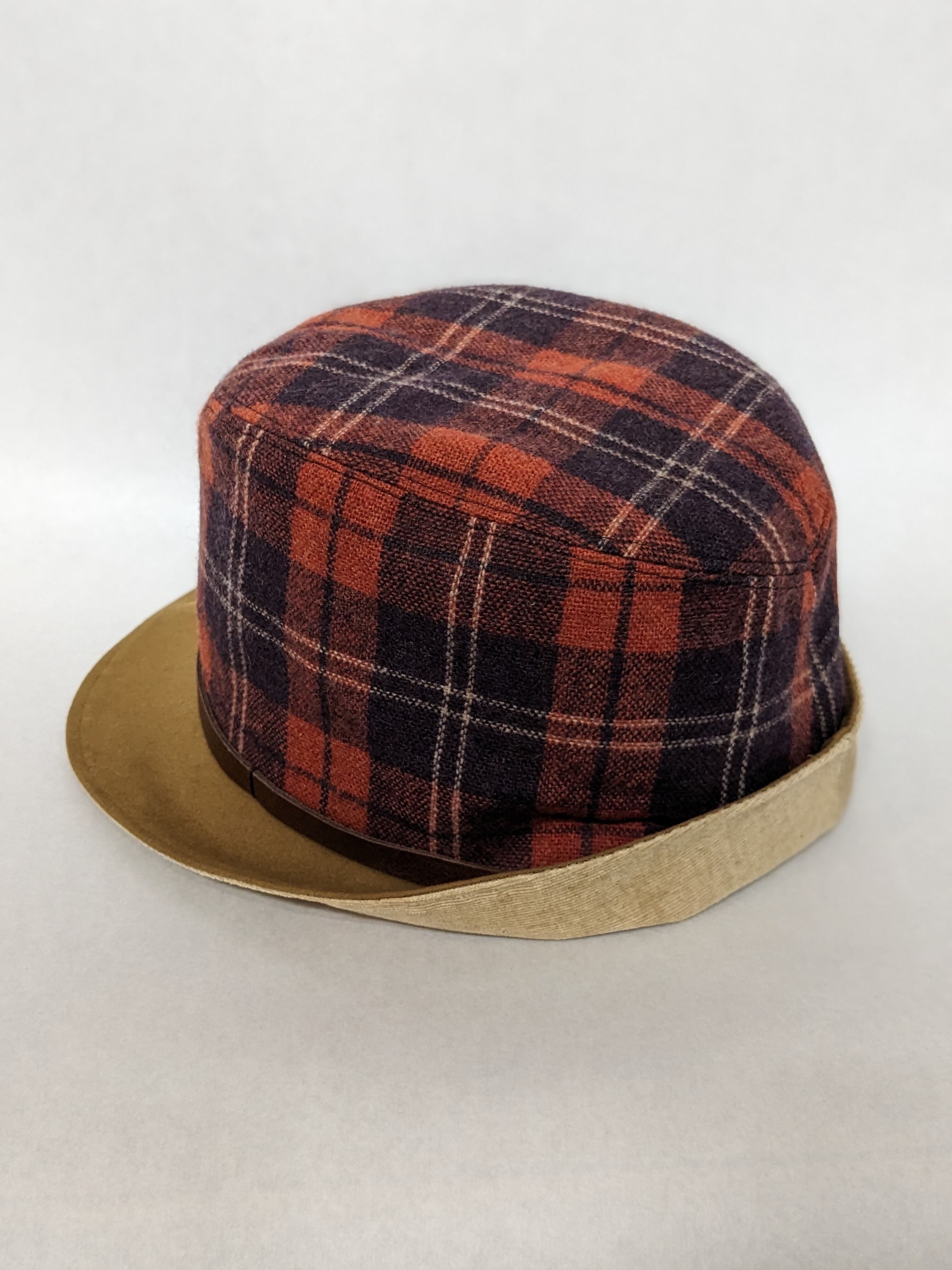 温かいカラーのオレンジ系チェックに落ち着いたキャメルのツバを合わせました。