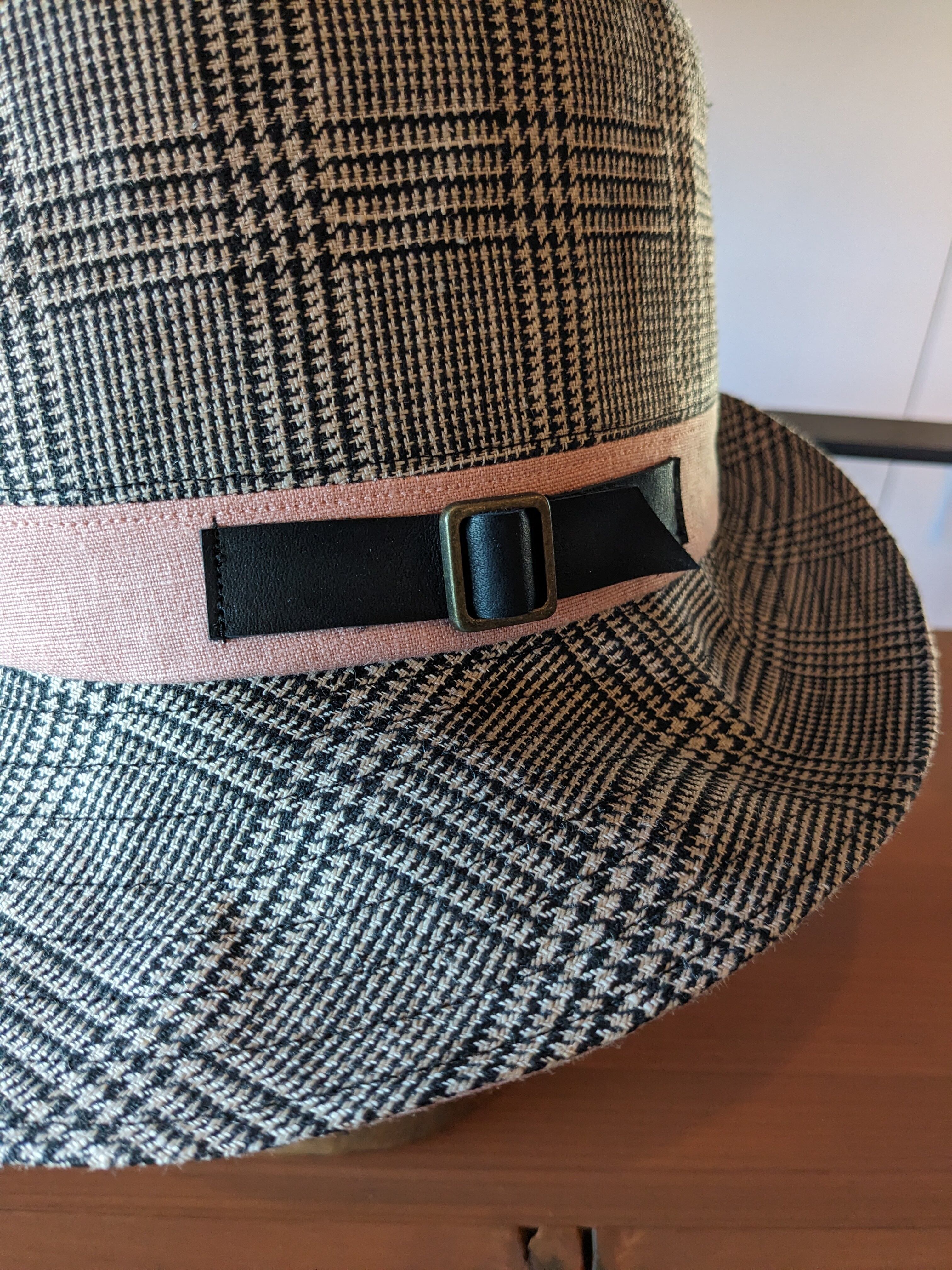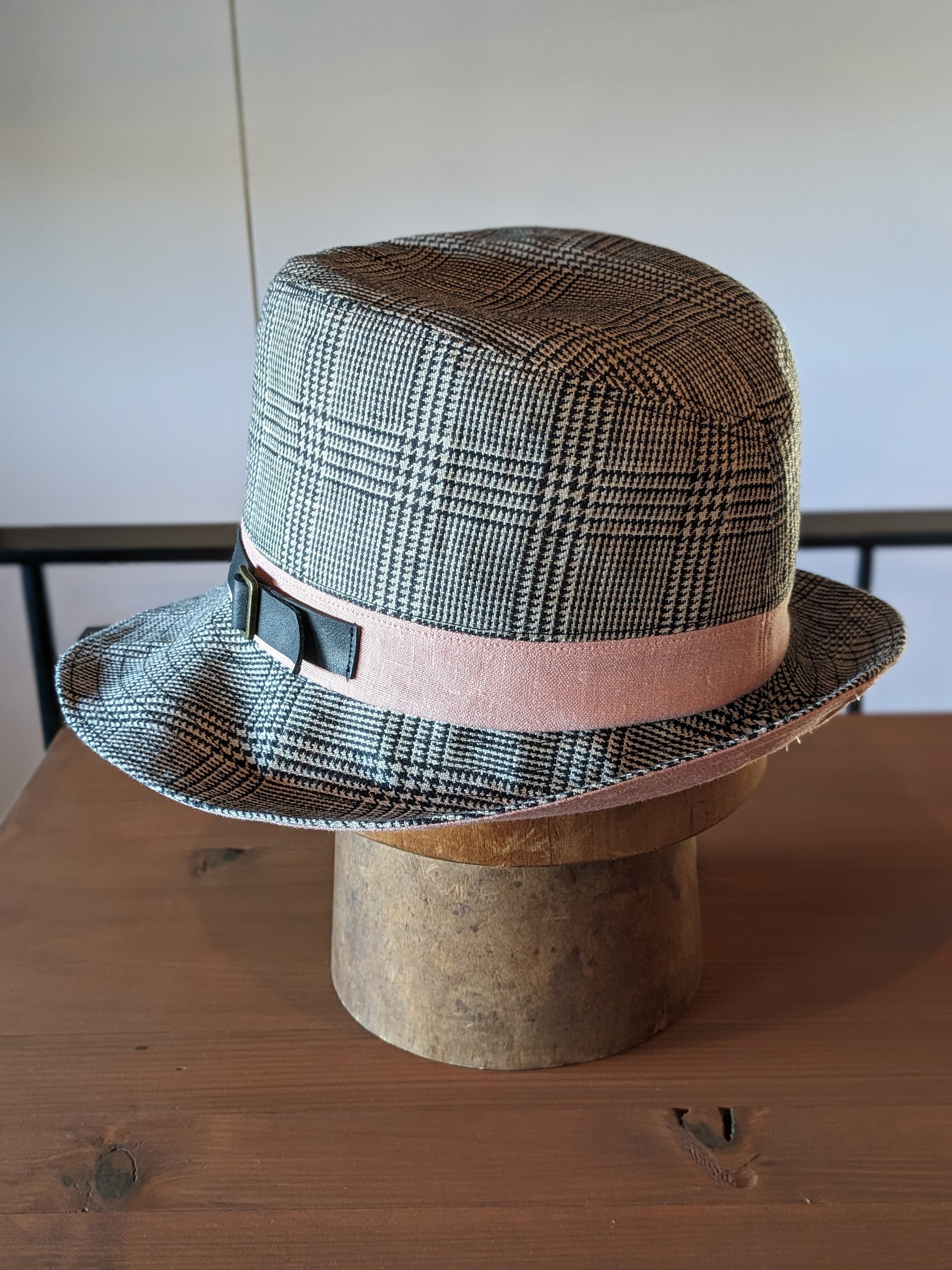 グレンチェック×スモーキーピンクのツバ広ハットです
