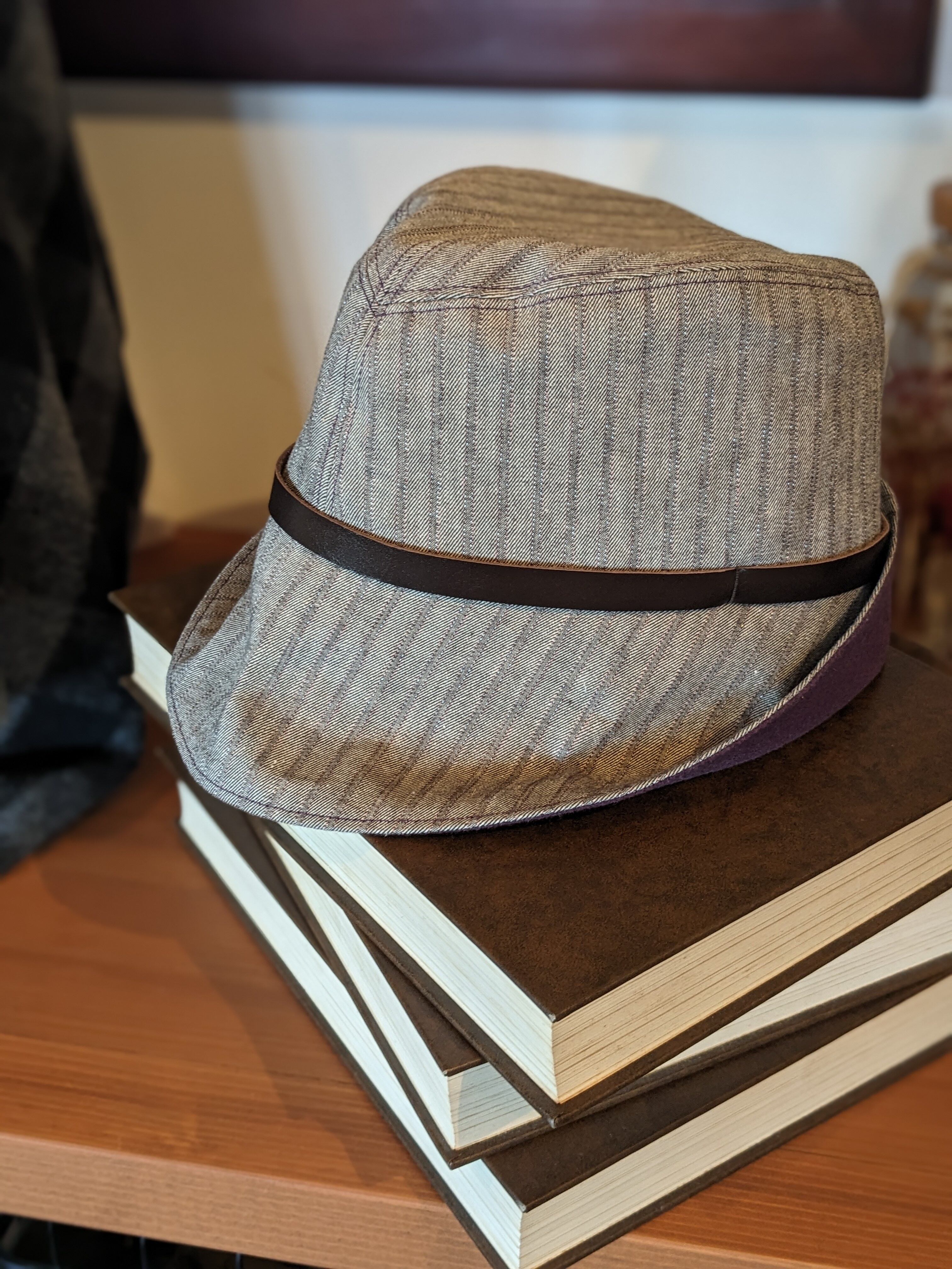グレー系の細めストライプ生地とツバ裏には起毛のパープル生地を合わせた落ち着いたカラーのハットです。
